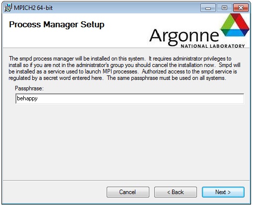 Open up an Administrator Command prompt and install the MPICH2 service with the commands: